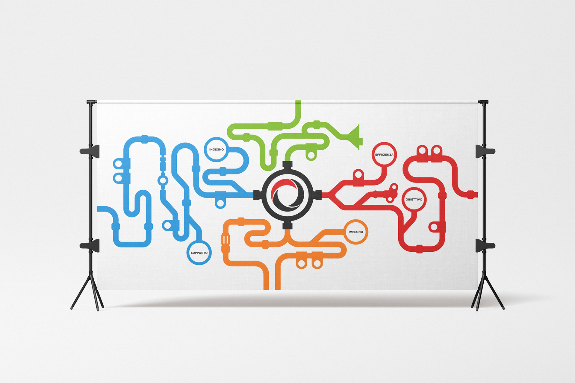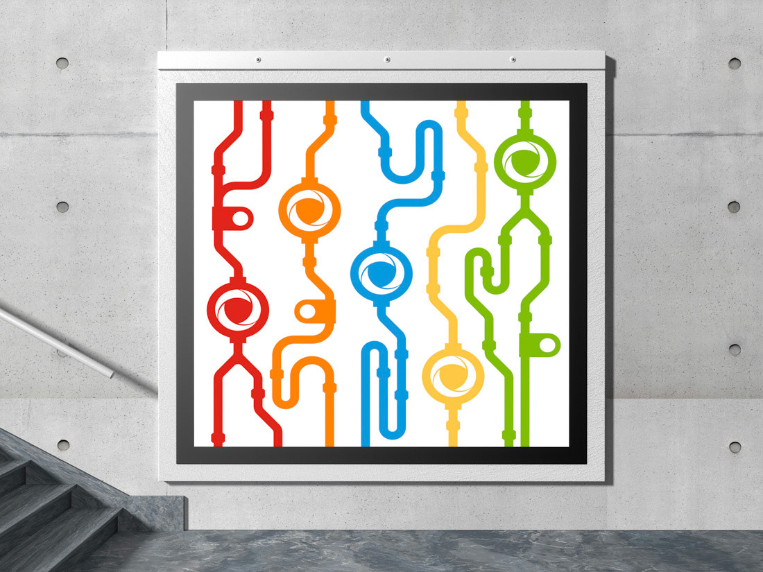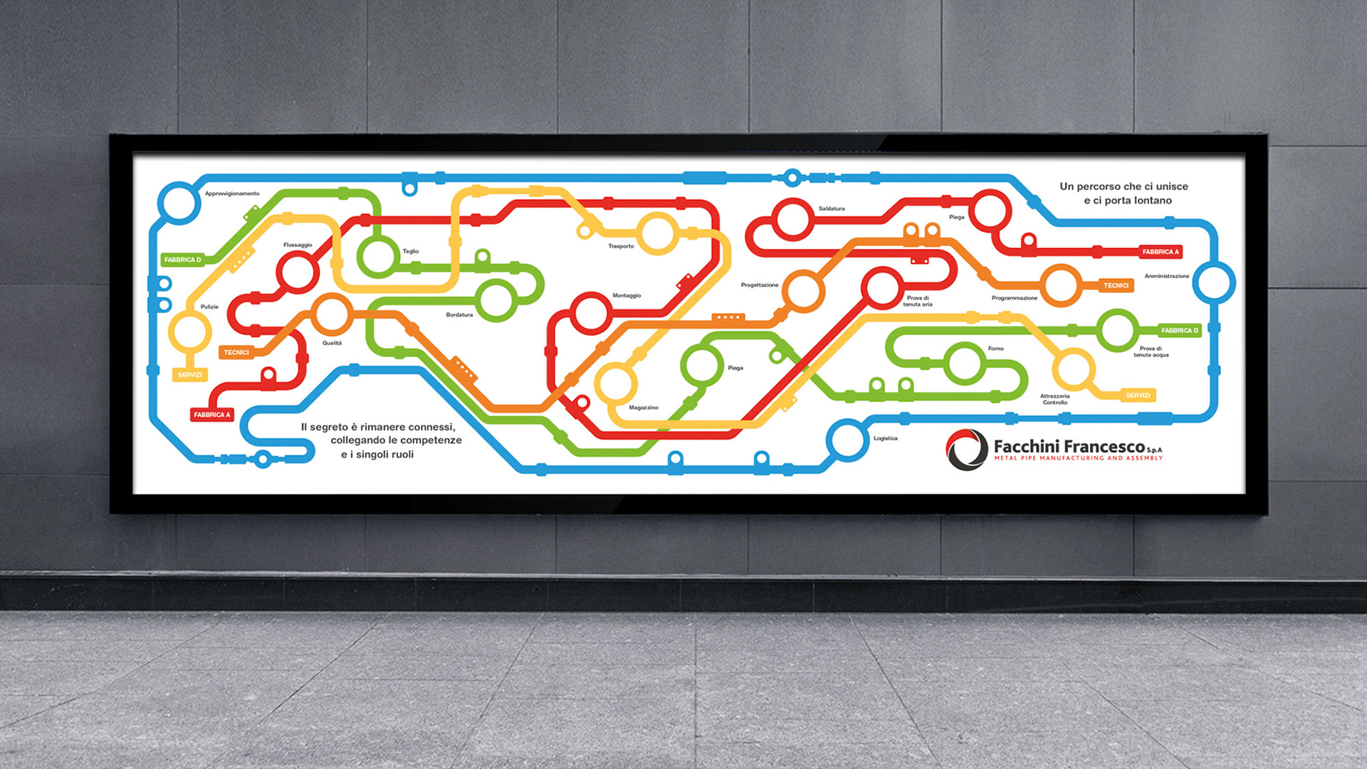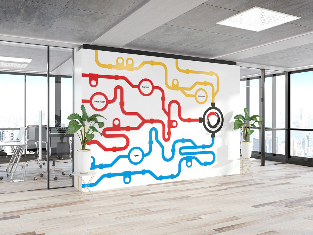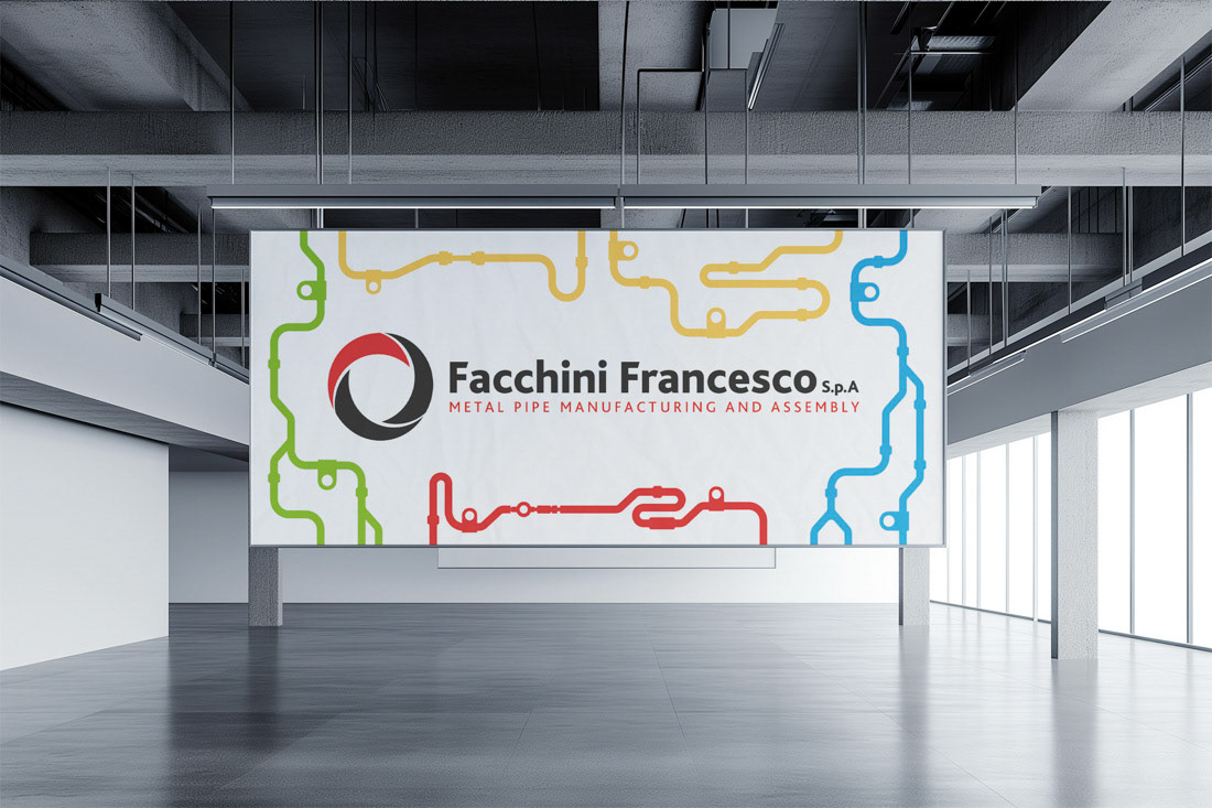 Explore custom interior signage and graphic designs created by Alessandro Bertoli for Francesco Facchini. Unique visuals inspired by the company's components, designed by a freelance graphic designer in Brescia.